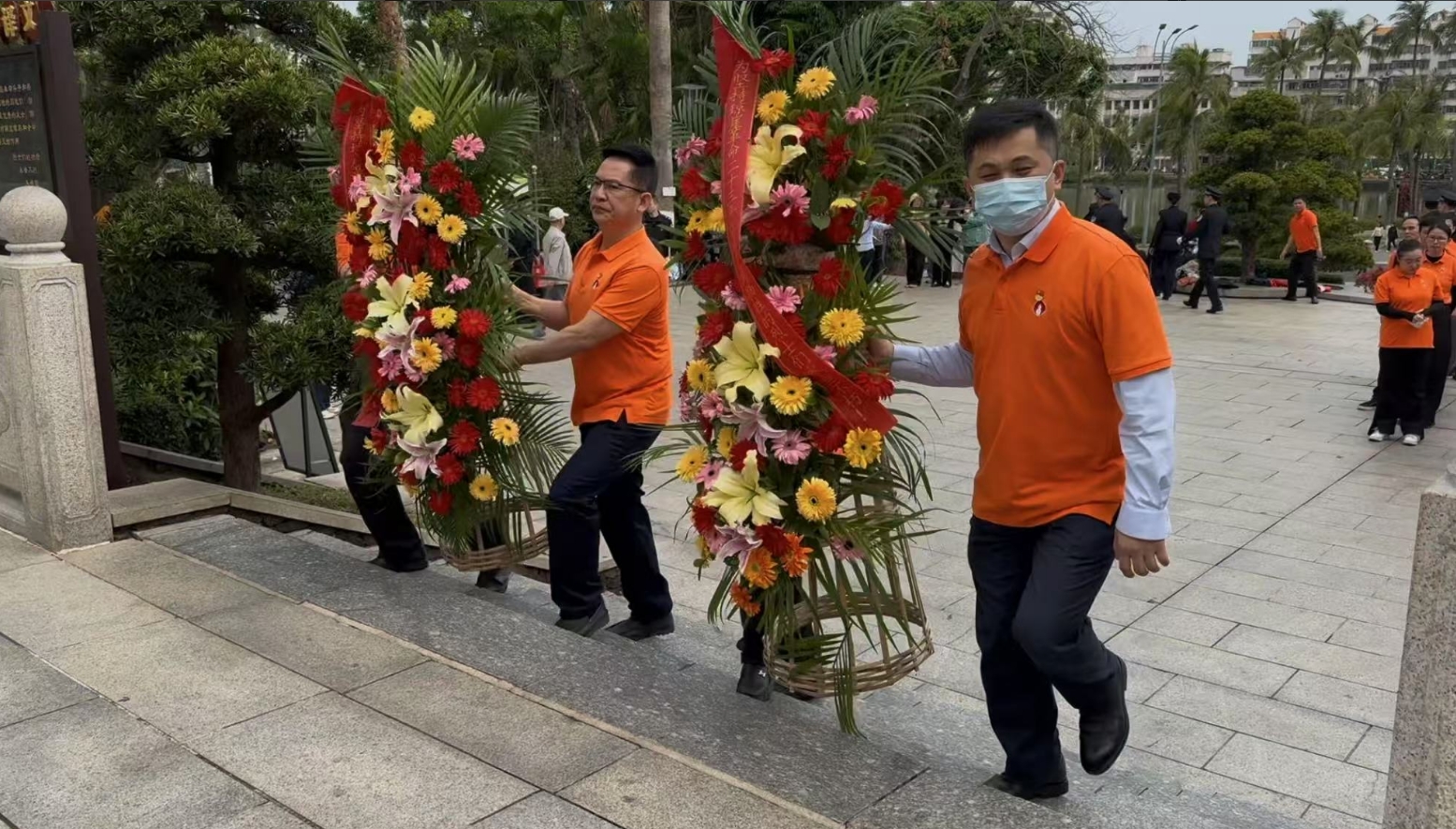 经过一段时间的等待才轮到永乐高。永乐高首先向烈士敬献花篮,花篮缎带上写着“为坚持琼崖革命23年红旗不倒牺牲的烈士们永垂不朽!”“为解放海南岛渡海牺牲的烈士们永垂不朽!”鲜艳的花篮寄托永乐高对革命先辈的崇敬和哀思。